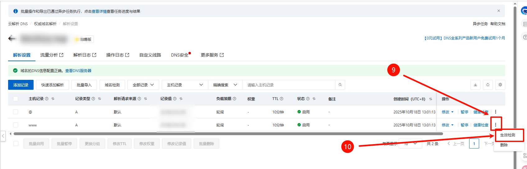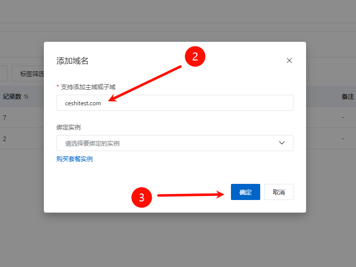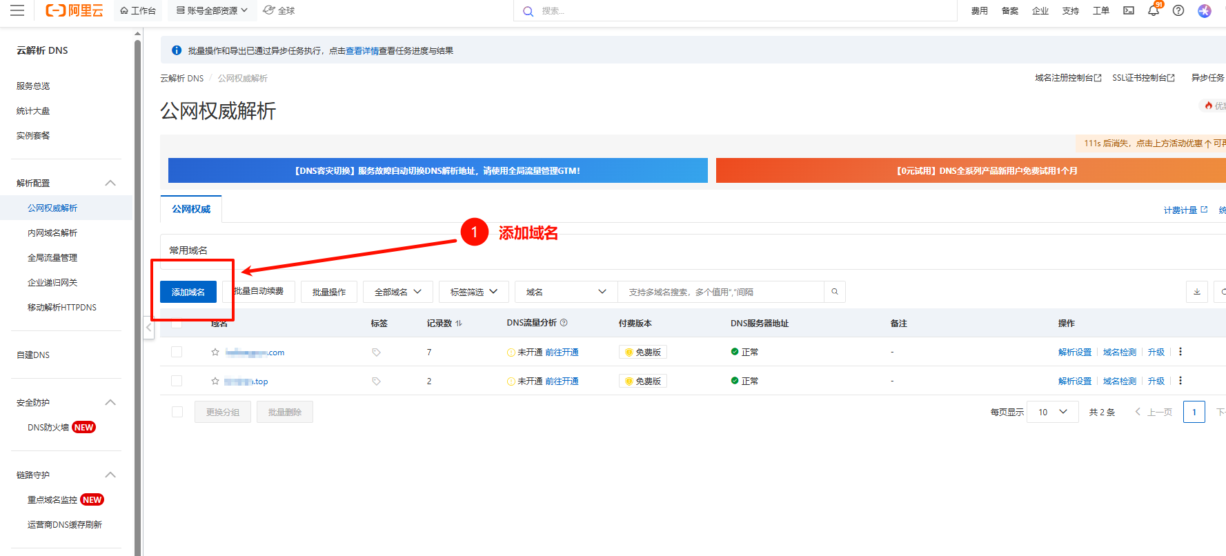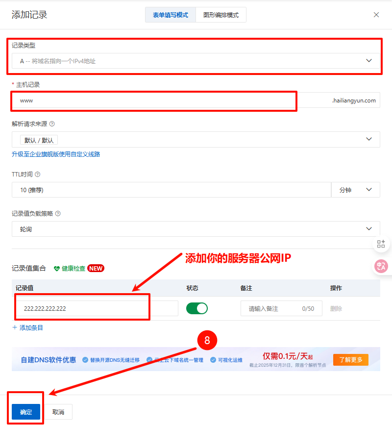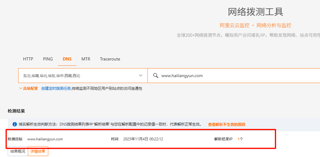 ## 阿里云DNS解析域名 https://dnsnext.console.aliyun.com/authoritative ### 1.访问以上网址进入阿里云DNS解析服务,点击添加域名  ### 2.在添加域名弹框添加一级域名(不加前缀),点击确定  ### 3.在添加的域名后面点击解析设置  ### 4.点击“添加解析”或“快速添加解析” > 快速添加解析更加简单,对新手更加友好  ### 5.点击“添加解析”,如果解析的是网站可根据以下指引进行填写 **①记录类型**:如果是解析网站就选 `A--` ,如果是邮箱就选 `MX--` **②主机记录**就是域名前缀,常用主机记录及含义如下: www表示域名 www.你的域名.com(网站的话默认选这个) @表示主域名 你的域名.com *泛解析,表示满足格式 *.你的域名.com 的所有域名 mail表示域名 mail.你的域名.com,常用于邮箱业务的解析设置 m表示域名 m.你的域名.com ,常用于手机网站 二级域名,如abc.你的域名.com,则写abc 多级域名,如ab.cd.你的域名.com,则写ab.cd **③记录值**:填入你的服务器公网IP地址 填完点击**确定**  ### 6.到此DNS解析完成,一般10分钟左右生效,最短不到一分钟就生效了,如果需要验证是否生效,按以下操作 ### 7.点击主机记录为 `www` 的主机记录最后面的图标,会有个`生效检测`,点击`生效检测`  ### 8.点击生效检测进入网络拨测工具,自动进行测试是否生效  ### 9.如生效检测结果会生成一条结果,说明解析已生效,就可以用域名正常访问网站了
